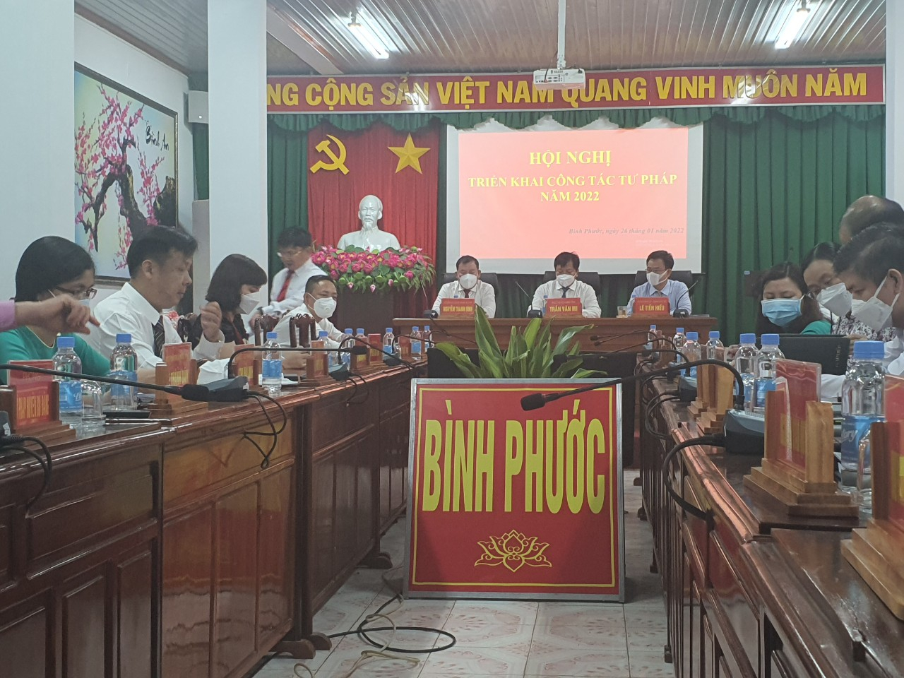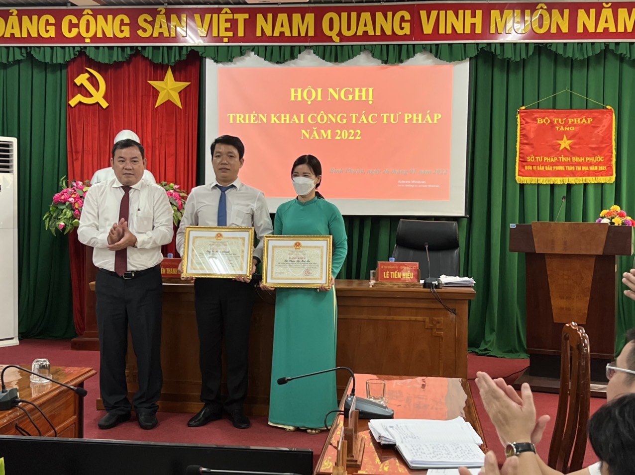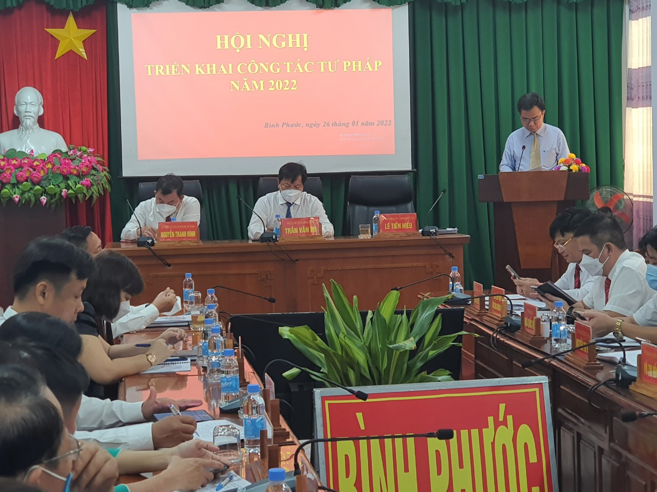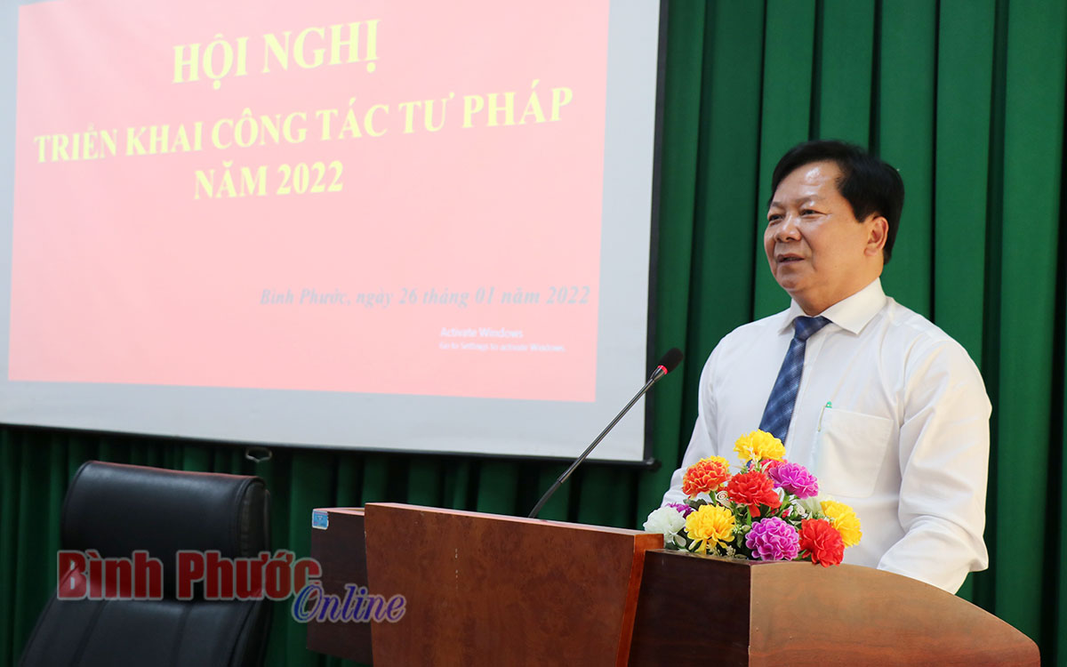 (Phó chủ tịch UBND tỉnh Trần Văn Mi phát biểu chỉ đạo tại Hội nghị) Phát biểu chỉ đạo tại Hội nghị Phó chủ tịch UBND tỉnh - Trần Văn Mi nhấn mạnh, với những kết quả đã đạt được trong năm 2021 của Sở Tư pháp được Bộ Tư pháp, Tỉnh ủy, UBND tỉnh ghi nhận và đánh giá cao. Vì vậy năm 2022 ngành tư pháp tiếp tục phát huy những kết quả đã đạt được, đồng thời tranh thủ sự quan tâm chỉ đạo của Tỉnh ủy, HĐND, UBND tỉnh, sự hướng dẫn chuyên môn của Bộ Tư pháp để tham mưu UBND tỉnh triển khai thực hiện tốt các nhiệm vụ được giao. Trong đó cần đẩy mạnh cải cách hành chính, cải cách tư pháp; bám sát kế hoạch của Trung ương, Tỉnh ủy, UBND tỉnh có liên quan đến ngành tư pháp, tăng cường công tác thanh tra, kiểm tra đối với lĩnh vực công chứng, đấu giá tài sản và các lĩnh vực quản lý nhà nước của ngành tư pháp, quan tâm đào tạo, bồi dưỡng cán bộ thực hiện nhiệm vụ tinh thông, chuyên nghiệp; tăng cường ứng dụng công nghệ thông tin trong quản lý, điều hành công việc... ( Đ/c Lê Tiến Hiếu - Giám đốc Sở Tư pháp triển khai nhiệm vụ công tác tư pháp năm 2022 tại Hội nghị) (Quang cảnh Hội nghị) (Quang cảnh Hội nghị) (Đồng chí Nguyễn Thanh Bình - Cục trưởng Cục công tác phía Nam - Bộ Tư pháp trao Bằng khen của Bộ trưởng Bộ Tư pháp cho các cá nhân đạt thành tích xuất sắc trong năm 2021) Ghi nhận kết quả đạt được Bộ Tư pháp đã xếp loại hạng A trong phong trào thi đua năm 2021 và tặng thưởng danh hiệu Cờ thi đua cho ngành Tư pháp tỉnh Bình Phước năm 2021; đồng thời tặng Bằng khen của Bộ trưởng Bộ Tư pháp cho 2 cá nhân thuộc Sở Tư pháp tỉnh Bình Phước./. Tác giả bài viết: Lê Thành